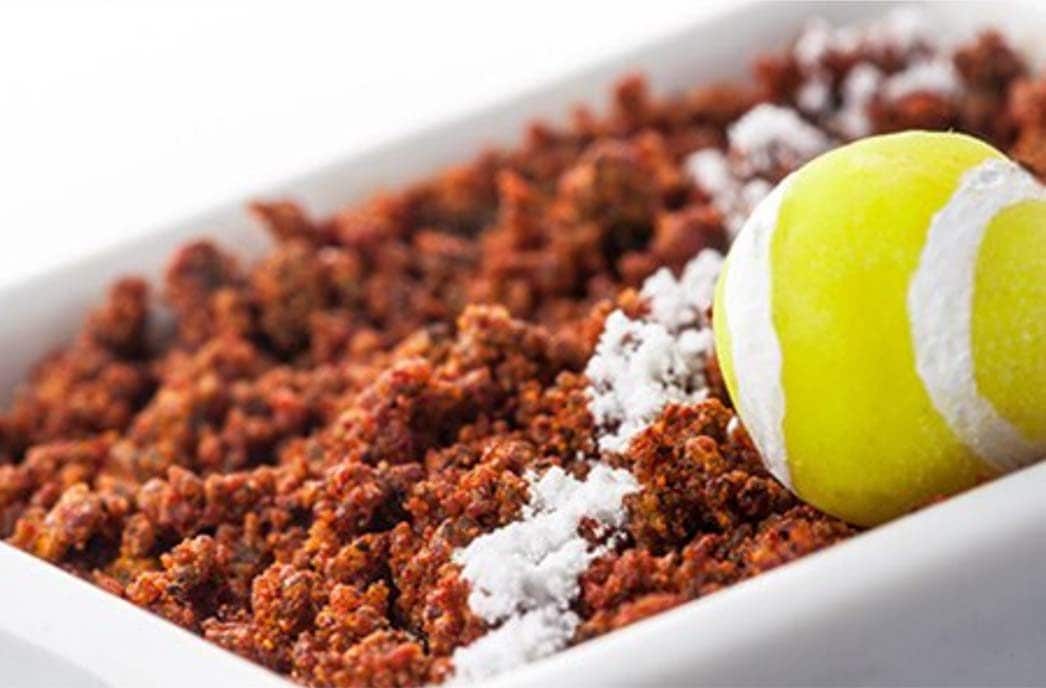 Terrain de Café, eine kreative Idee des Lavazza Training Centers, ist eine Hommage an das prestigeträchtigste Sandplatz-Turnier. Eine Haselnuss-Ganache wird mit Kaffee bedeckt, und ihr orangefarbener Überzug aus Kaffee symbolisiert den Sandplatz des Roland-Garros-Turniers. Für die Kaffeeschicht wird ein neuer salziger Crumble zubereitet, der zu 30 % aus Kaffeesatz (von bereits gebrühtem Kaffee) besteht. Der auf dieses Spielfeld gelegte Tennisball ist nichts anderes als eine mit weißer Schokolade und Zitrone überzogene Haselnusspraline. Die Kreation stammt von G. Gabino.