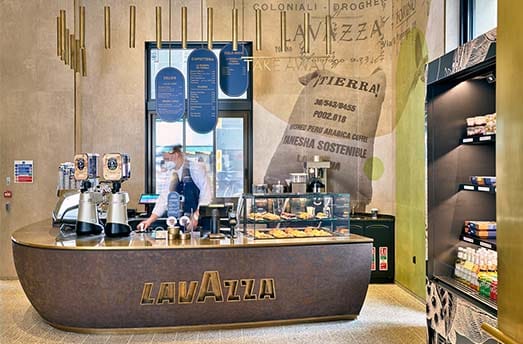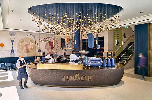 Lavazza hat sich immer dafür engagiert, authentische italienische Kaffeetraditionen zu fördern und gleichzeitig die Zukunft und Innovation im Blick zu haben. Zu diesem Zweck gestaltete Lavazza ein modernes Ladenkonzept mit Beiträgen von renommierten Designern für eine einzigartige Verbraucherreise. Die Bereiche Cafeteria, Lebensmittel und Takeaway im Erdgeschoss zusammen mit der Gastronomie, einem Restaurantbereich in der ersten Etage, bieten ein 360°-Kaffee-Erlebnis.
